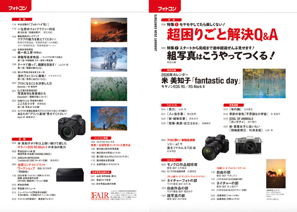 2025年12月15日 米美知子, カレンダー, カメラ, 新製品, フォトコン, 組写真, 写真上達, 月例コンテスト, 撮影術, スナップ photocon admin 米美知子 カレンダー カメラ 新製品 フォトコン 組写真 写真上達 月例コンテスト 撮影術 スナップ フォトコン 毎月20日発売 定価1,500円+税 2026年1月号 Vol.625 目次 特集1 | モヤモヤしてたら楽しくない! 超困りごと解決Q&A 特集2 | スタートから完成まで途中経過ぜんぶ見せます! 組写真はこうやってつくる!! 特別付録 | 2026年カレンダー 米 美知子「fantastic day」 プロに聞く!新製品速報 ソニー a7V 富士フィルム X-T30 II 米美知子が1年以上使い続けて感じた キヤノンEOS R5 Mark IIの本当の魅力 Amazon.co.jpはこちらから フォトコン2025年12月号フォトコン2025年11月号フォトコン2025年10月号フォトコン2025年9月号フォトコン2025年8月号 2025年度 月例コンテスト 推薦・金賞受賞作品展&審査員トークショーフォトハイ句!2025年12月号新 農業女子に会いたい写真展 写団薬師 「ときのながれ」フィルター撮影スーパーガイド