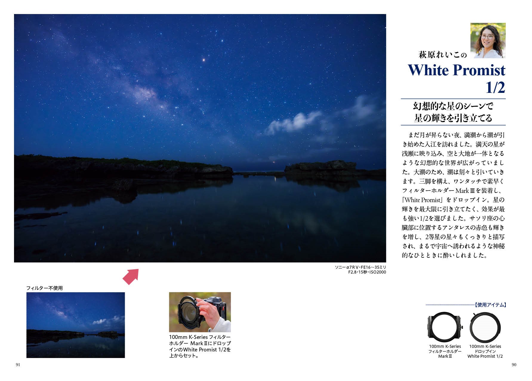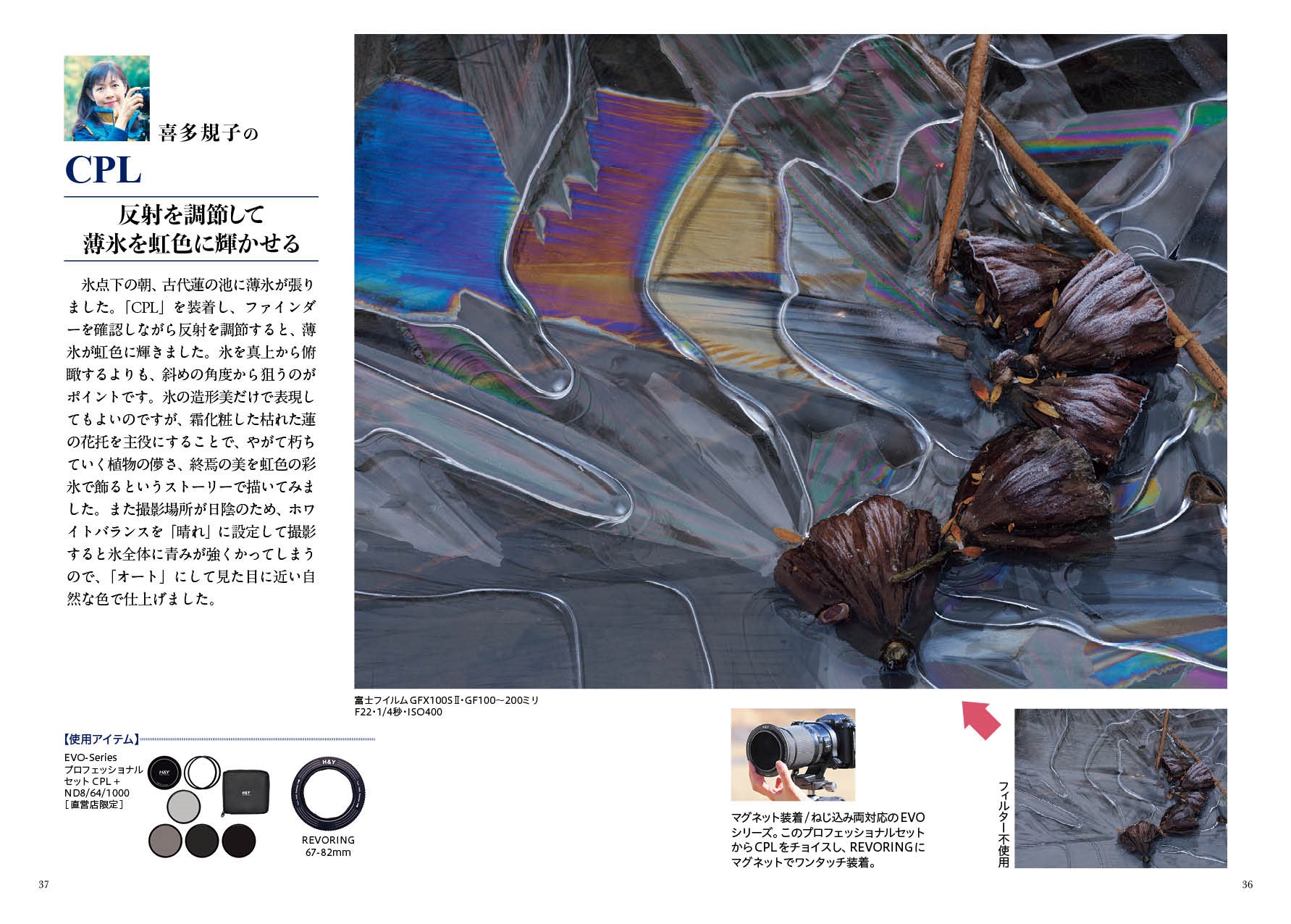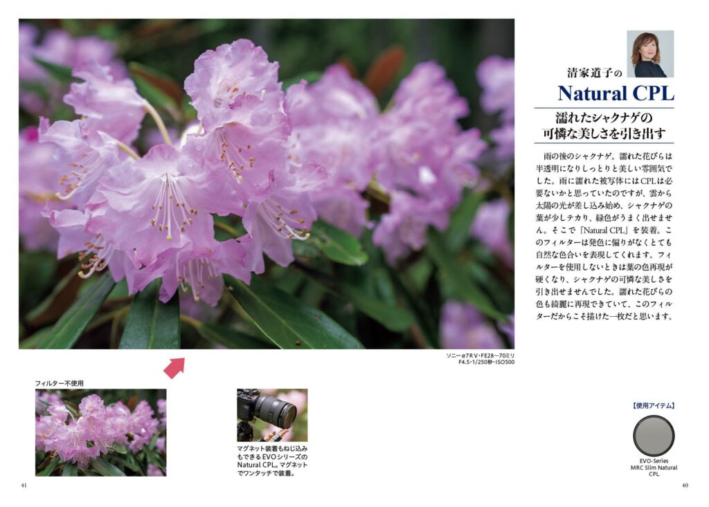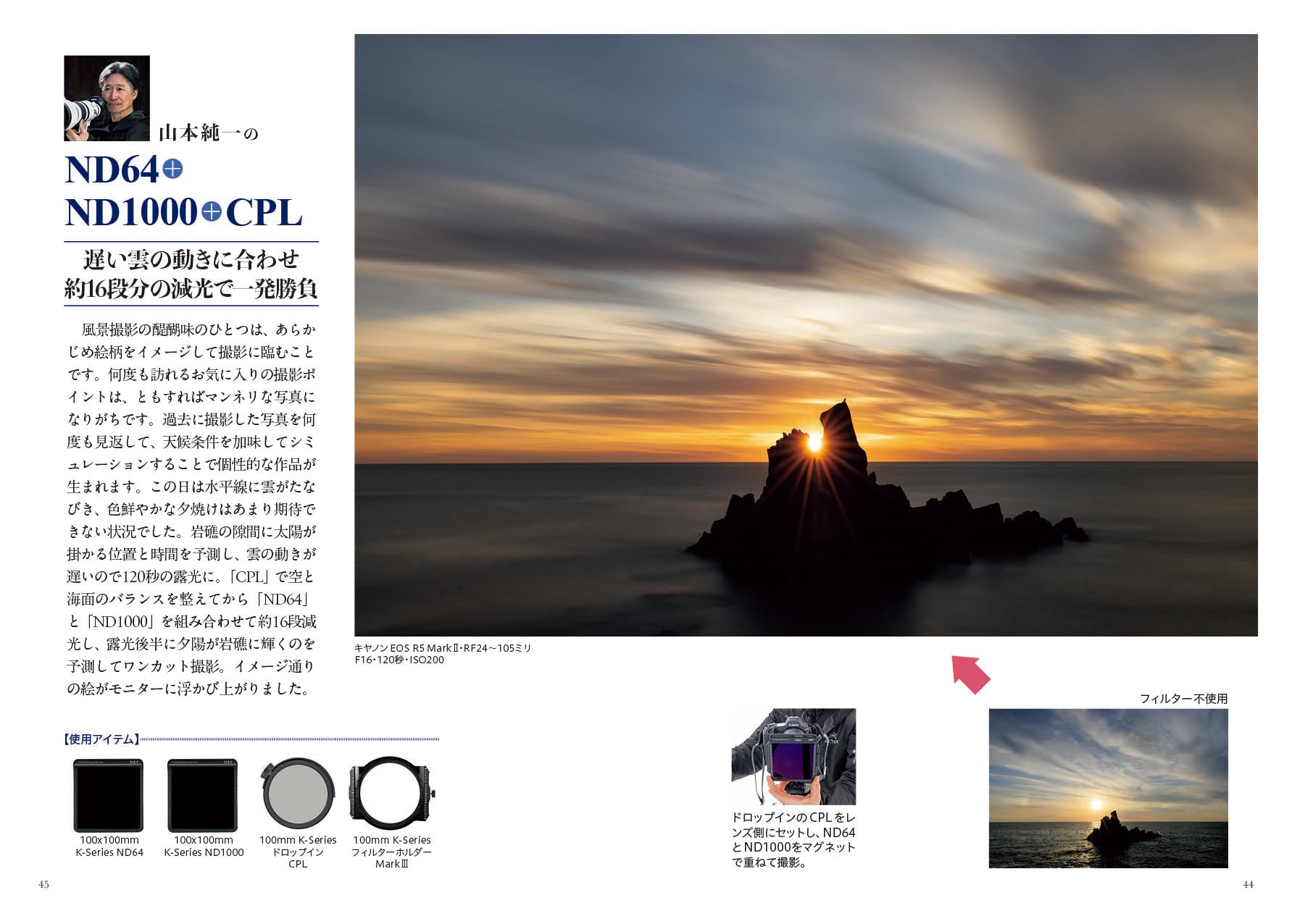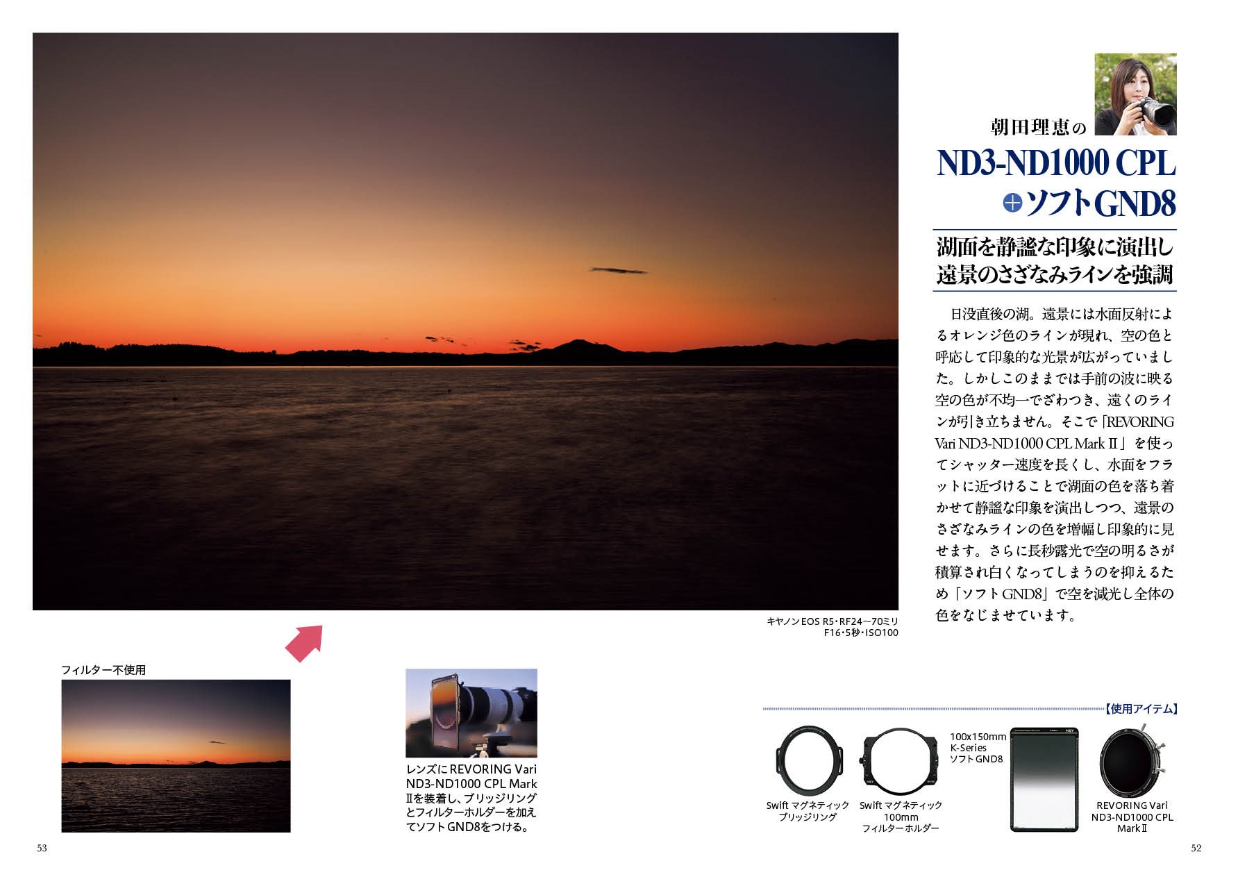 CPL、ND、GND(ハーフND)、ミスト系など、多様なフィルターの特徴紹介と、フィルター装着システムごとの操作法の解説。