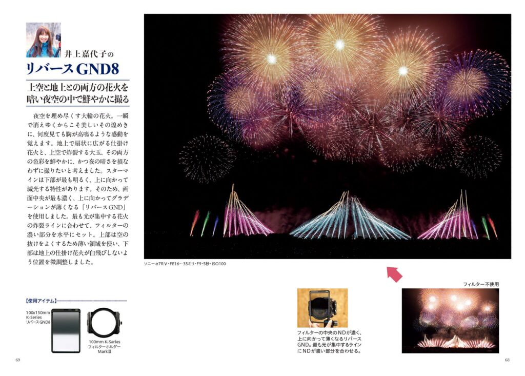 この本ではCPL、ND、GND(ハーフND)、ミスト系など、H&Yフィルターの主要フィルターについて、単体使用だけでなく複数のフィルターの組み合わせなど、プロの実践的な実写作品30例を紹介。もちろんフィルター不使用写真との比較でフィルター効果が before → after でリアルにわかります。また、装着システムごとの操作法や、愛用するプロ写真家のフィルターチョイスや活用法も紹介。
