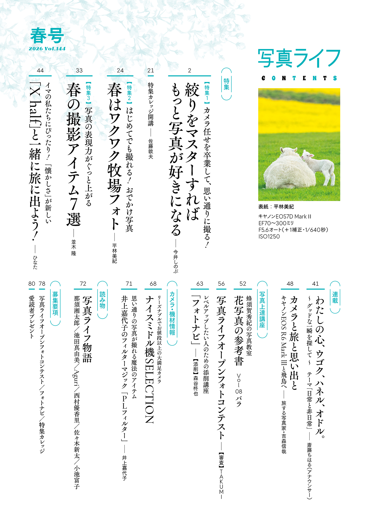 2026年3月9日 斎藤ちはる, 北海道, 車中泊, 星空撮影, 動物撮影, 撮影スポット, 写真ライフ, 鉄道写真 photocon admin 斎藤ちはる 北海道 車中泊 星空撮影 動物撮影 撮影スポット 写真ライフ 鉄道写真 写真ライフ 季刊 3・6・9・12月/17日発売 定価1,100円JAN : 4912044450467 2026年春号 No.144 オールカラー・84ページ 目次 特集1 カメラ任せを卒業して、思い通りに撮る! 絞りをマスターすればもっと写真が好きになる 特集2はじめてでも撮れる!おでかけ写真 春はワクワク牧場フォト 特集3写真の表現力がぐっと上がる 春の撮影アイテム7選 カメラと旅と思い出と 吉森信哉 好評連載 わたしの心、ウゴク、ハネル、オドル。 ~グッド!な一瞬を探して~ テーマ「日常と非日常」 斎藤ちはる(アナウンサー) Amazon.co.jpはこちらから 写真ライフ 143冬号写真ライフ 142秋号写真ライフ 141夏号写真ライフ 140春号写真ライフ 139 冬号 写真ライフ143冬号は本日発売です!