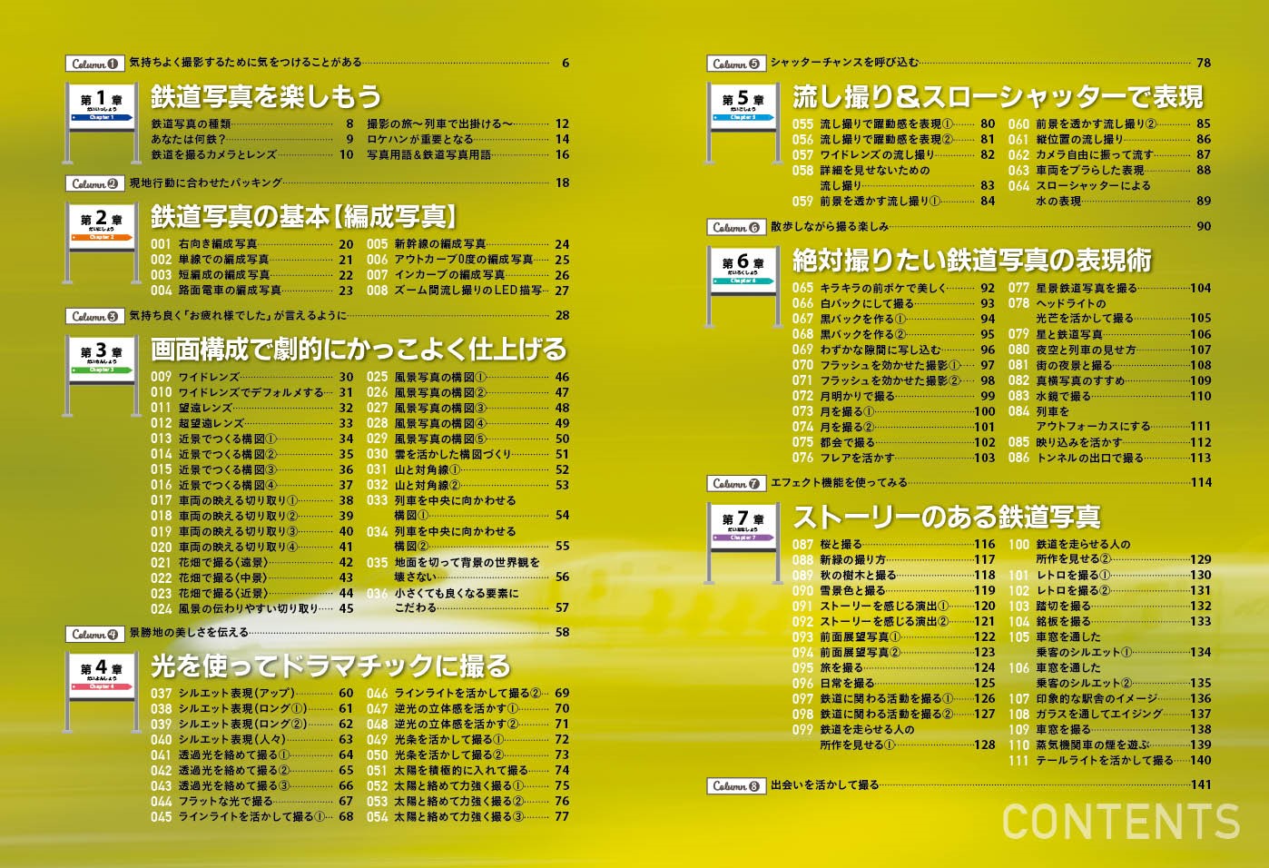 鉄道好きがより魅力的な写真を撮るために、撮影の理論や表現技法を学ぶ重要性を説き、図鑑的な車両写真にとどまらない幅広い鉄道写真の可能性を、111の項目にわたって作品とともに紹介しています。